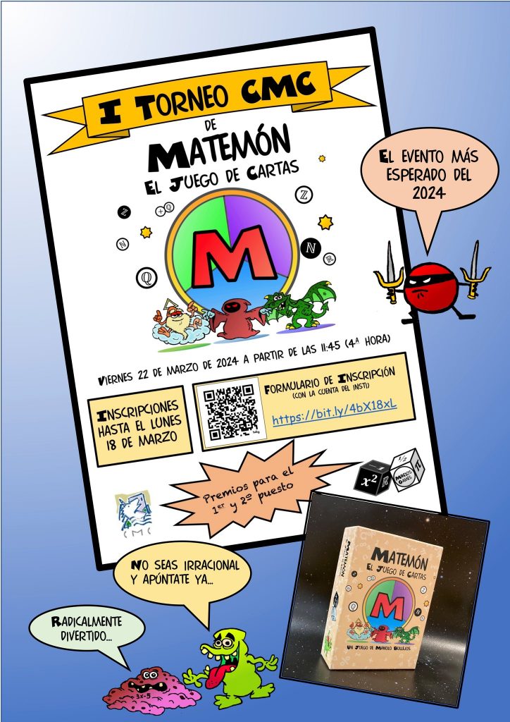 El próximo viernes 22 de marzo de 2024 se celebrará en el IES Concha Méndez Cuesta el primer Torneo CMC de Matemón, el juego de cartas, donde hasta 16 participantes competirán para alcanzar la gloria y convertirse en el mejor controlador de matemones del instituto.