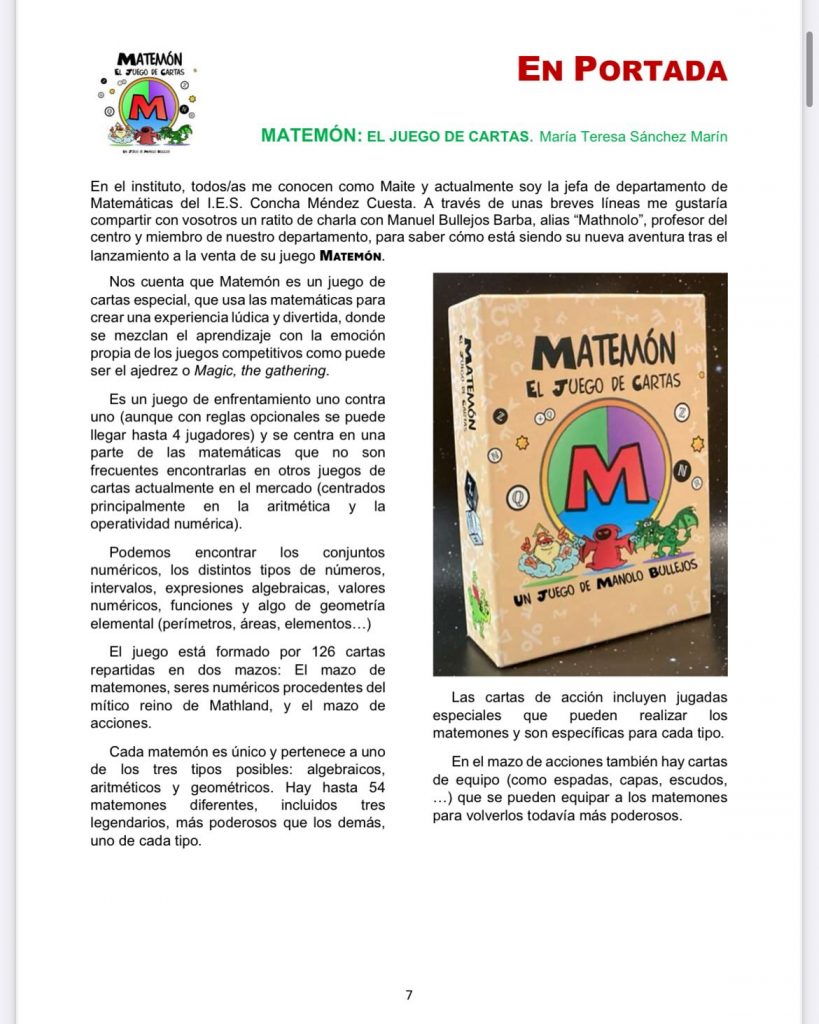 El Boletín del Primer Trimestre del curso 2024-2025 de InvestigArte del IES Concha Méndez Cuesta, abre con Matemón en portada y entrevista al creador, realizada por mi compañera Maite Sánchez, como primer artículo . Muy agradecido también a D. Sergio Díaz, director del centro, por las palabras dedicadas, tanto al juego como al autor, en la presentación del número. ☺️