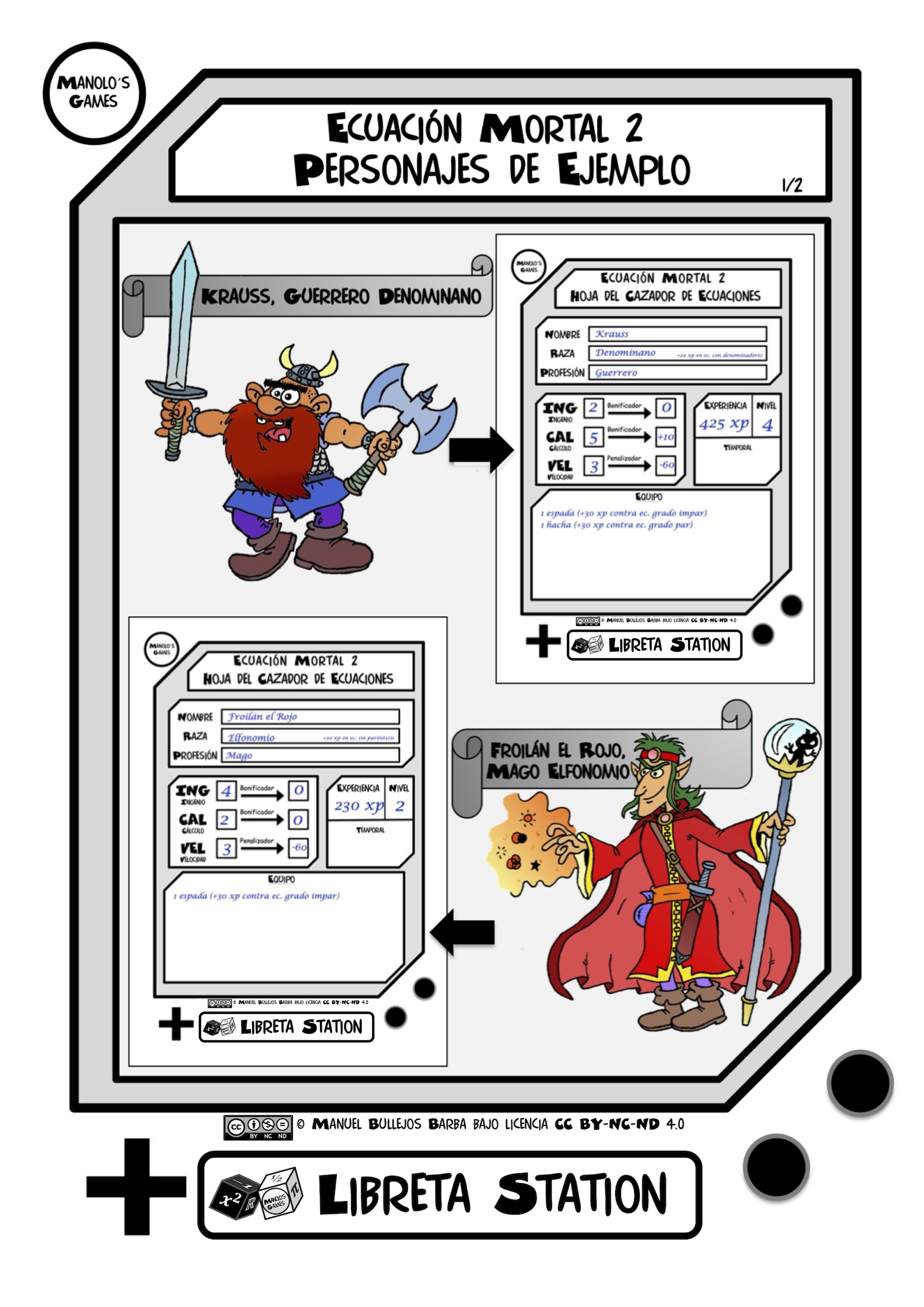Este recurso consiste en un documento de dos páginas con cuatro personajes de ejemplo creados para que los jugadores se hagan una idea de como pueden empezar a imaginar a los suyos propios.