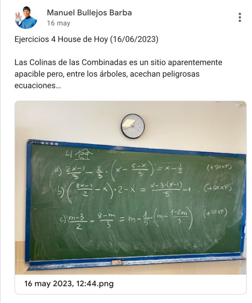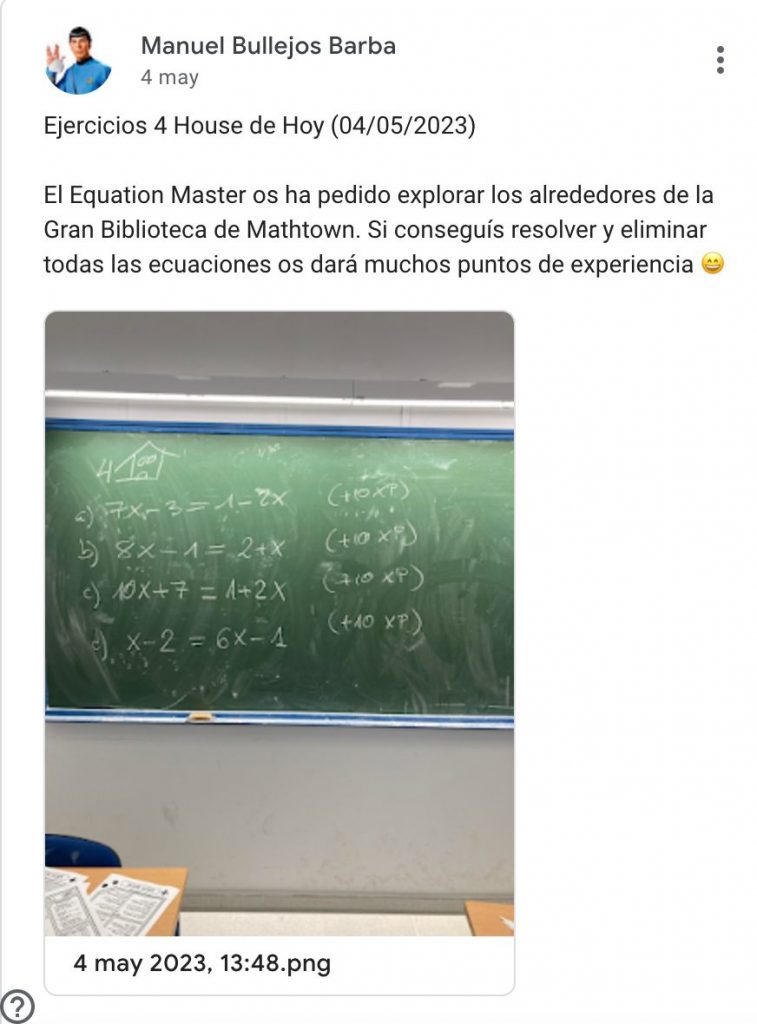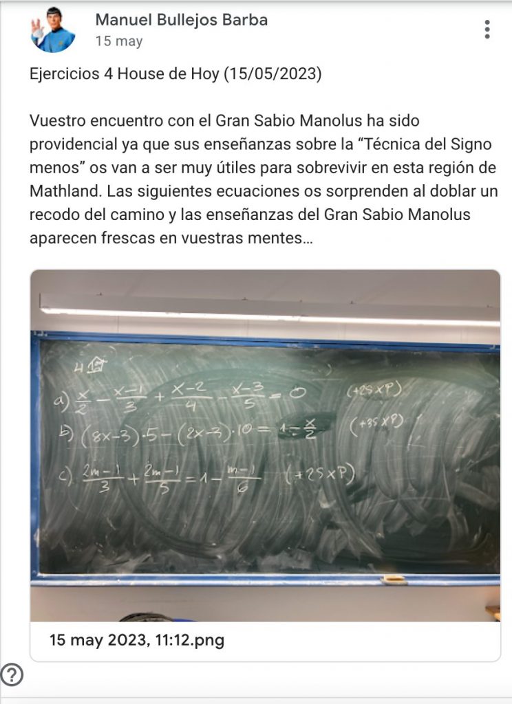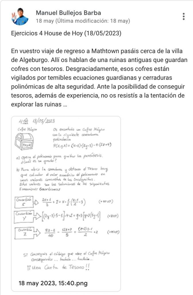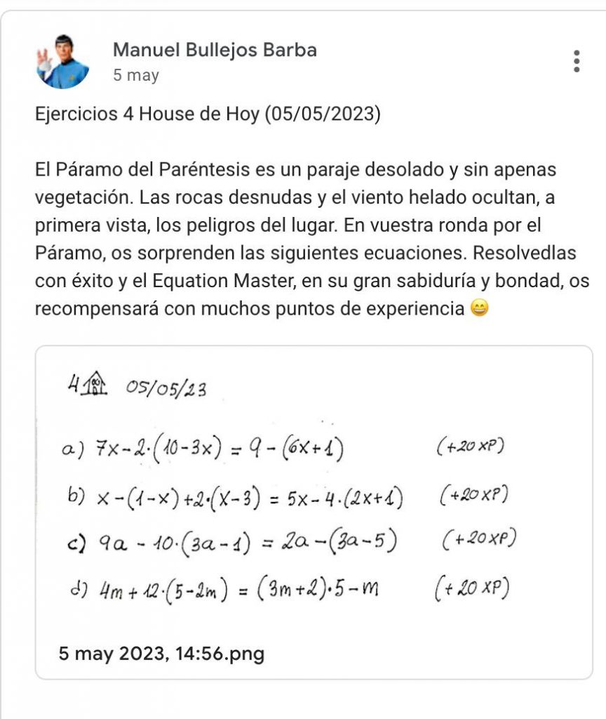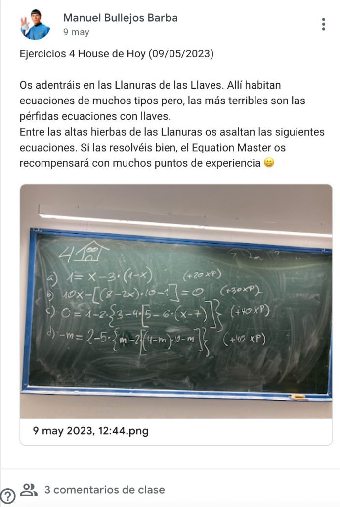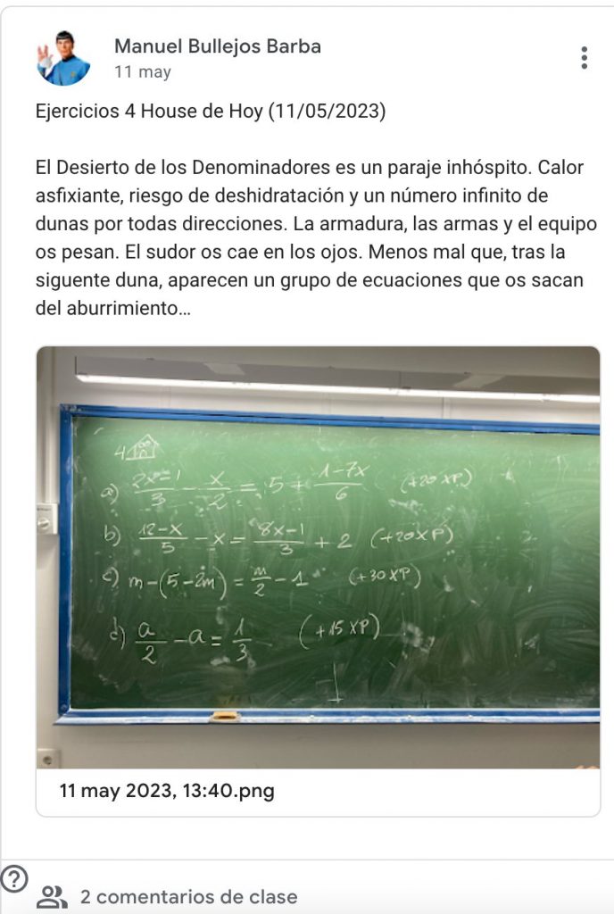 Por si os sirve de ayuda os comparto pantallazos de mi classroom a modo de crónicas de aventuras, de cómo he ido mandando las tareas y cómo he ido construyendo el relato de la historia. No sé cómo, pero la historia ha terminado con el Príncipe Manolo secuestrado por los pérfidos problemas de las Praderas Problemáticas. Los aventureros y aventureras se han entrenado duro en las técnicas del Problem Kombat y la Aventura Final (el control) será la misión de rescate. Ya os contaré si al final consiguen rescatarlo o no 😄