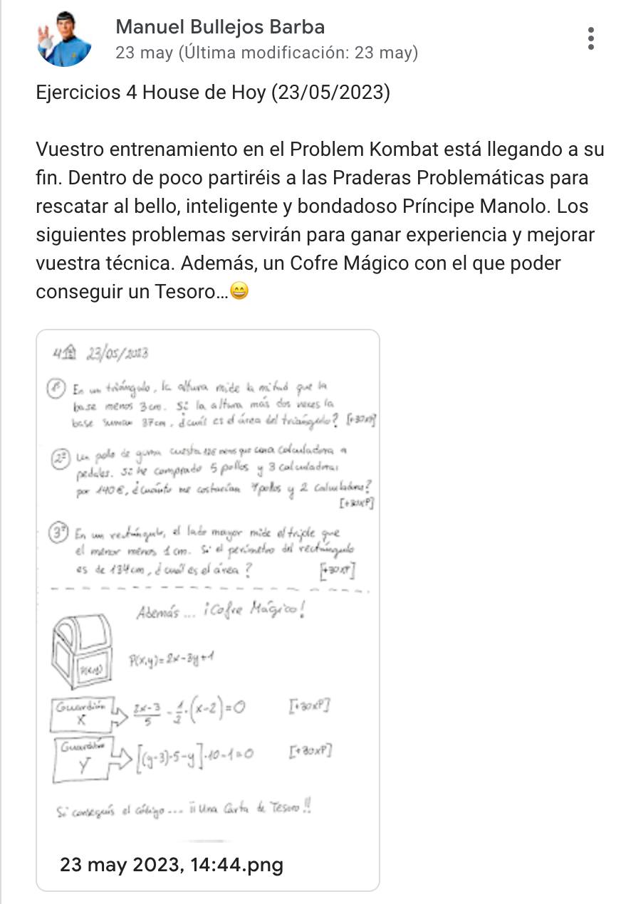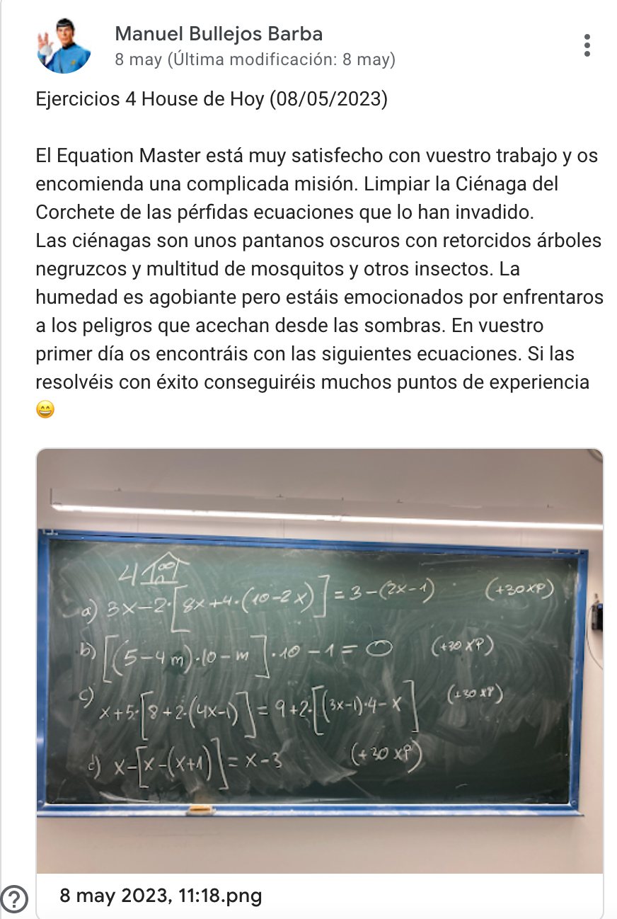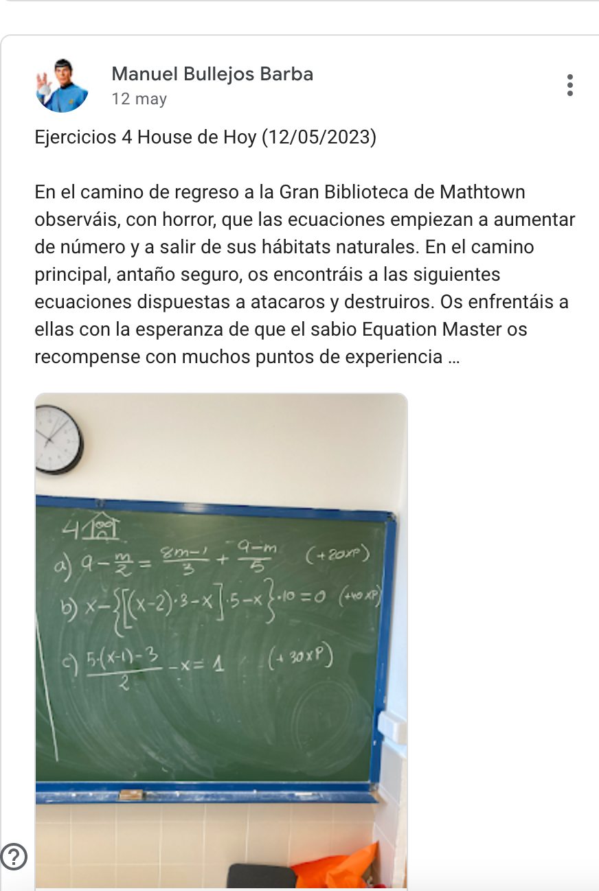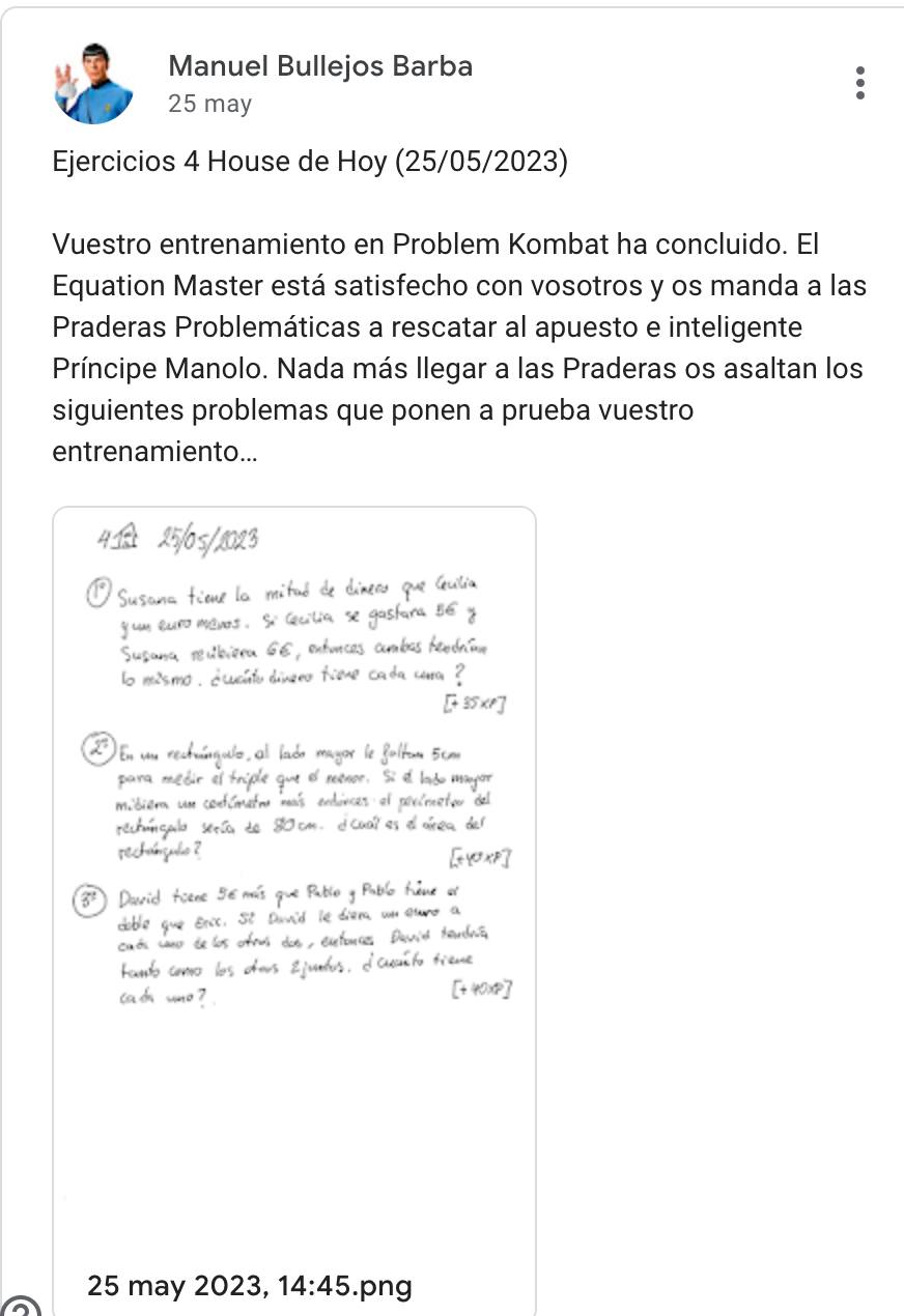 Por si os sirve de ayuda os comparto pantallazos de mi classroom a modo de crónicas de aventuras, de cómo he ido mandando las tareas y cómo he ido construyendo el relato de la historia. No sé cómo, pero la historia ha terminado con el Príncipe Manolo secuestrado por los pérfidos problemas de las Praderas Problemáticas. Los aventureros y aventureras se han entrenado duro en las técnicas del Problem Kombat y la Aventura Final (el control) será la misión de rescate. Ya os contaré si al final consiguen rescatarlo o no 😄