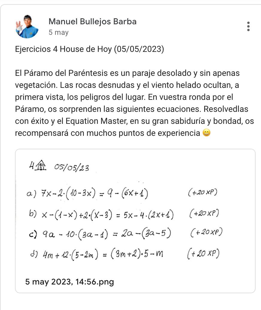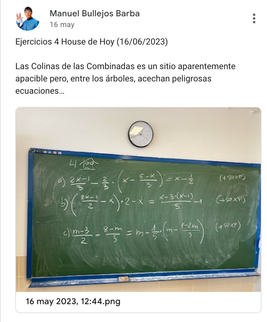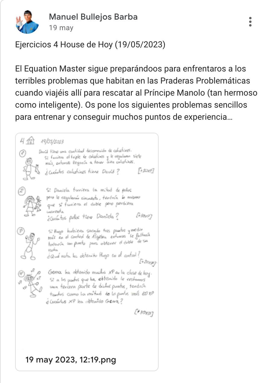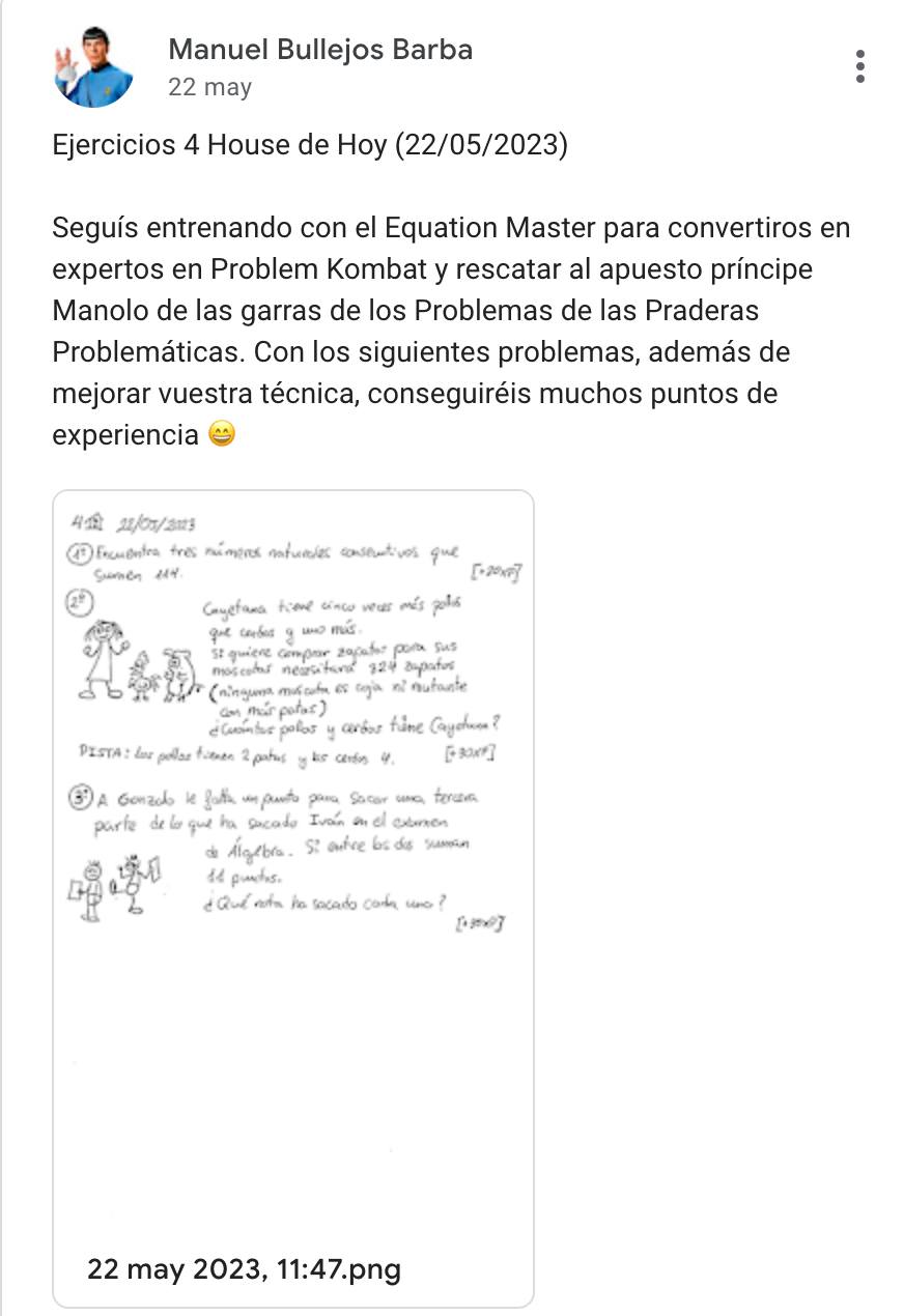 Por si os sirve de ayuda os comparto pantallazos de mi classroom a modo de crónicas de aventuras, de cómo he ido mandando las tareas y cómo he ido construyendo el relato de la historia. No sé cómo, pero la historia ha terminado con el Príncipe Manolo secuestrado por los pérfidos problemas de las Praderas Problemáticas. Los aventureros y aventureras se han entrenado duro en las técnicas del Problem Kombat y la Aventura Final (el control) será la misión de rescate. Ya os contaré si al final consiguen rescatarlo o no 😄